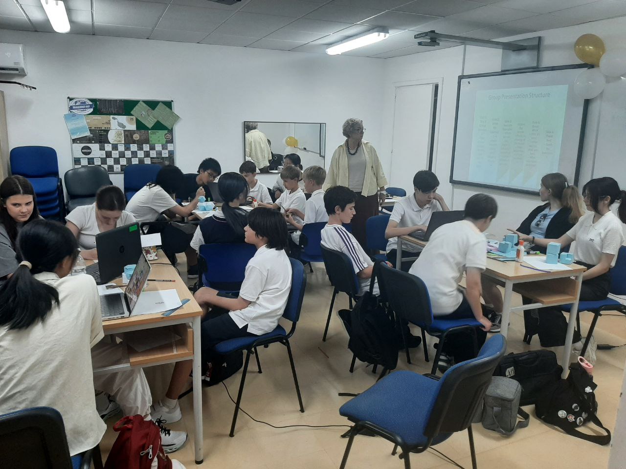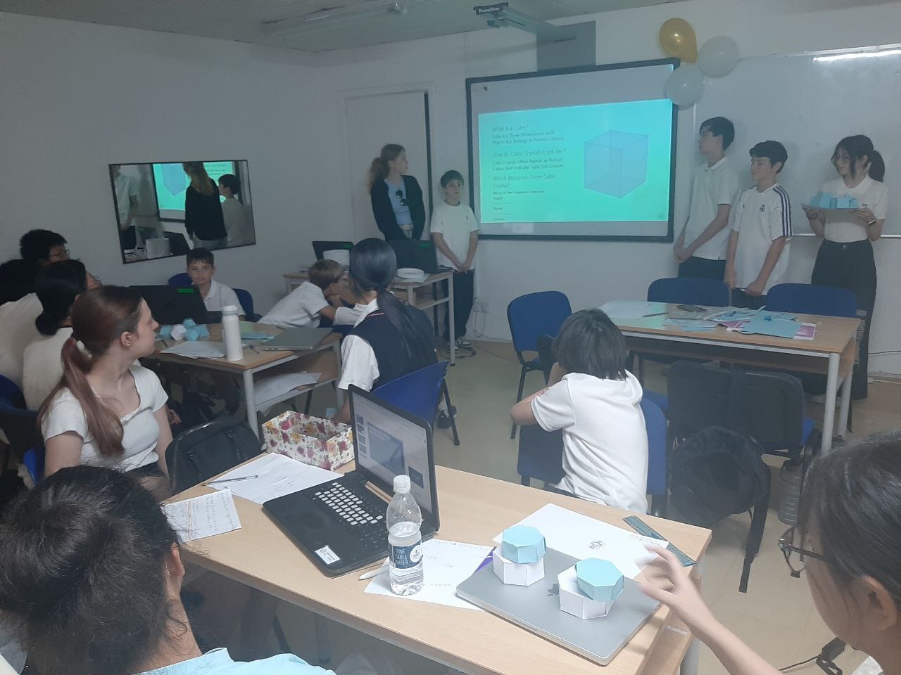 Presentation skills: we practiced using a presentation creation program, spoke English, showed models, and explained what we had learned.