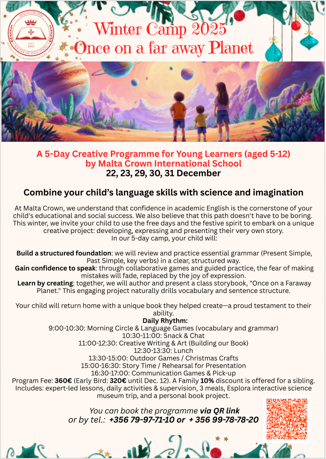 Malta Crown School has prepared two engaging 5-day holiday programmes (22, 23, 29, 30, 31 December 2025) so that your children can spend their winter break brightly, creatively, and with maximum benefit for their English skills.